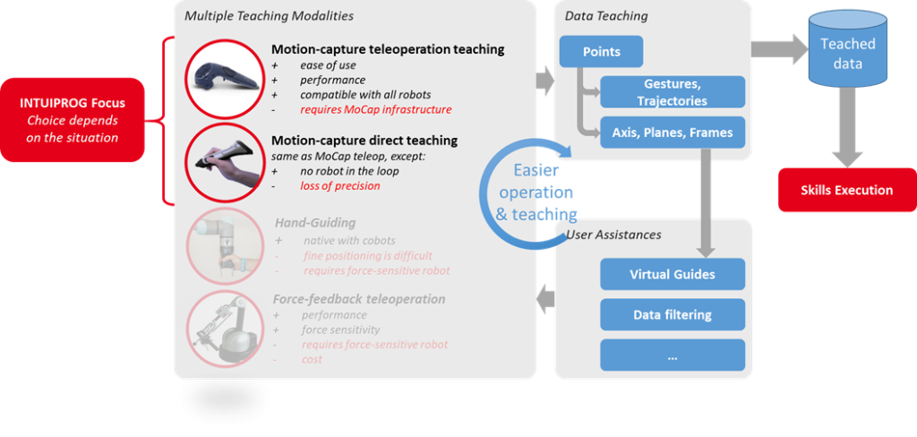 - Module d’apprentissage flexible multimodal : motion-capture offline ou téléopéré, téléopération à retour d’effort, hand-guiding. Des fonctions d’assistance (guides virtuels, post-traitement des données apprises) permettent de faciliter la démonstration.