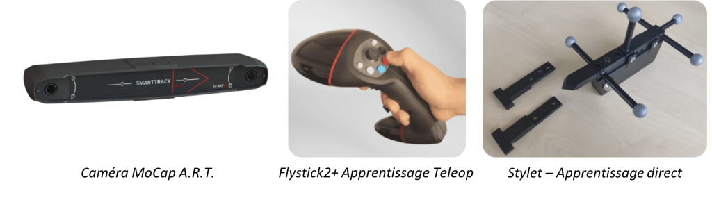 Après de premières expérimentations avec d’autre matériel (HTC Vive dans le projet européen MERGING), nous avons retenu le matériel de la marque A.R.T., qui se distingue par sa facilité de déploiement et sa précision de tracking. Le matériel utilisé est composé d’une caméra stéréo pré-calibrée, d’une télécommande Flystick2+ utilisée pour l’apprentissage téléopéré, et d’un stylet prototype utilisé pour l’apprentissage direct. A.R.T. Fournit également un stylet passif standard (measurement tool), qui peut être utilisé pour le même usage.