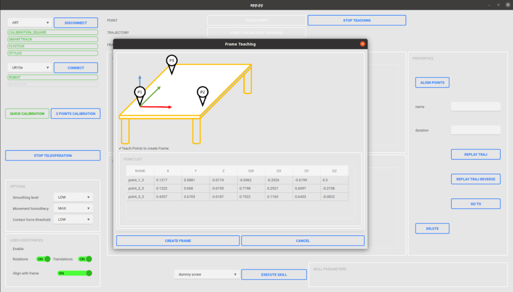 Un effort important a été consacré à l’interface utilisateur, car son ergonomie impacte directement l’ensemble du flux de travail. L’interface a été conçue pour rester minimale et facile d’usage, tout en fournissant l’ensemble des fonctionnalités nécessaires à l’usage du système : gestion et calibration du matériel (robot et MoCap), apprentissage de points, fonctions d’assistance, exécutions des compétences. La figure suivante illustre cette interface. Les fonctions (ici l’apprentissage de repère) sont documentées et illustrées pour faciliter leur prise en main.