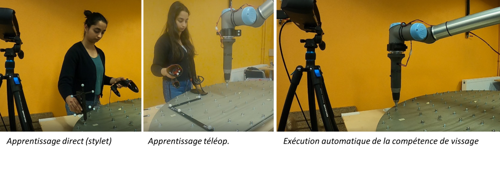 En apprentissage téléopéré, l’opérateur commence par apprendre le plan de travail, afin d’activer un guide virtuel bloquant le robot à la perpendiculaire du plan. Il peut alors apprendre l’ensemble des points, puis exécuter la compétence de vissage sur les points appris.