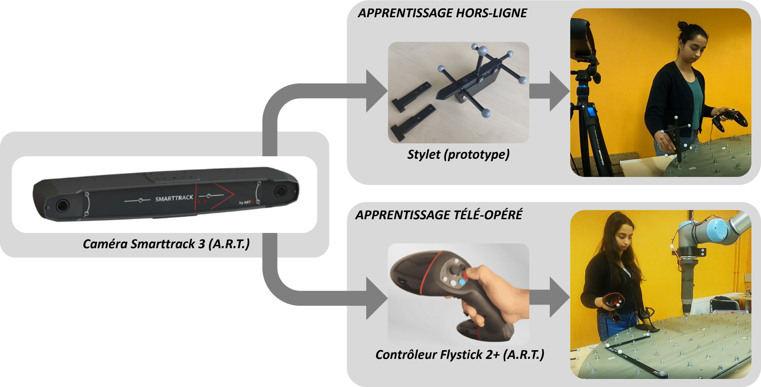 Après de premières expérimentations avec d’autre matériel (HTC Vive dans le projet européen MERGING), nous avons retenu le matériel de la marque A.R.T., qui se distingue par sa facilité de déploiement et sa précision de tracking. Le matériel utilisé est composé d’une caméra stéréo pré-calibrée, d’une télécommande Flystick2+ utilisée pour l’apprentissage téléopéré, et d’un stylet prototype utilisé pour l’apprentissage direct. A.R.T. Fournit également un stylet passif standard (measurement tool), qui peut être utilisé pour le même usage.